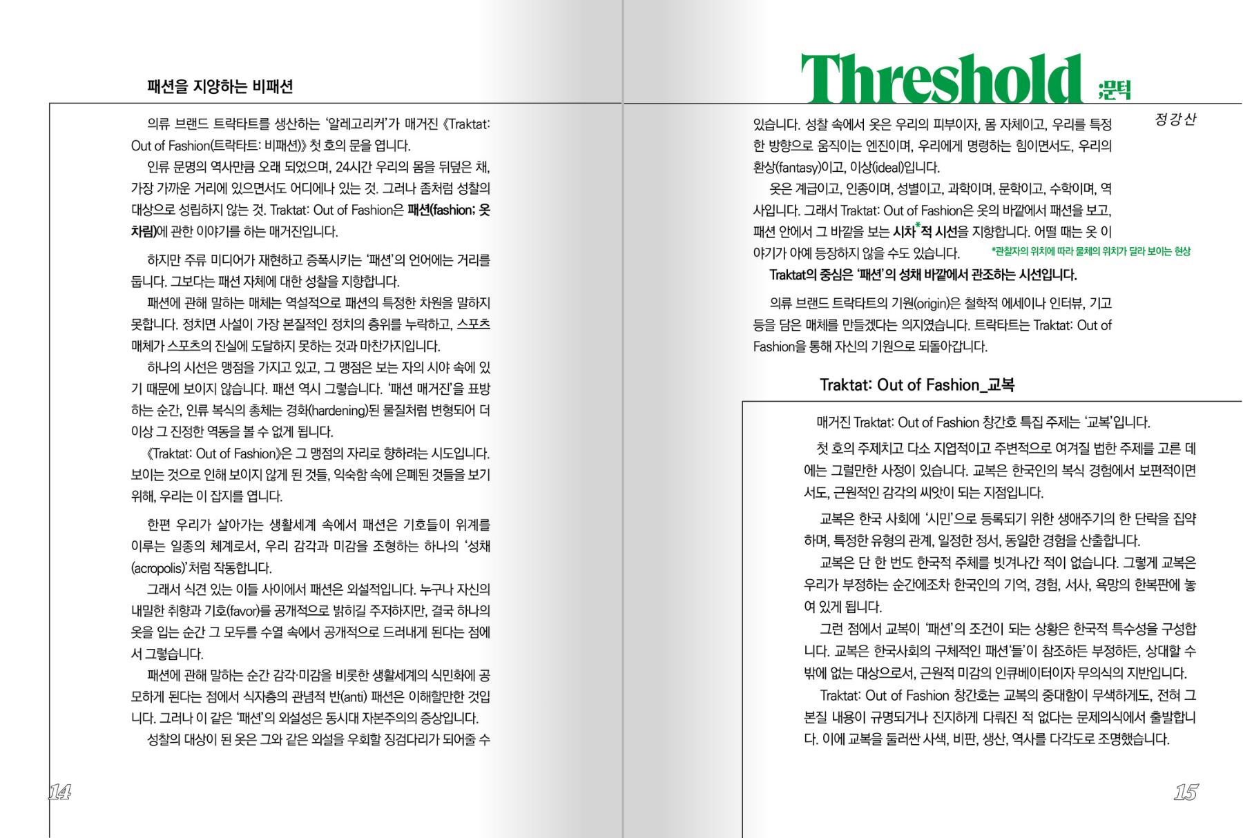 《Traktat: Out of Fashion》은 의류 브랜드 트락타트가 발행하는 매거진입니다.